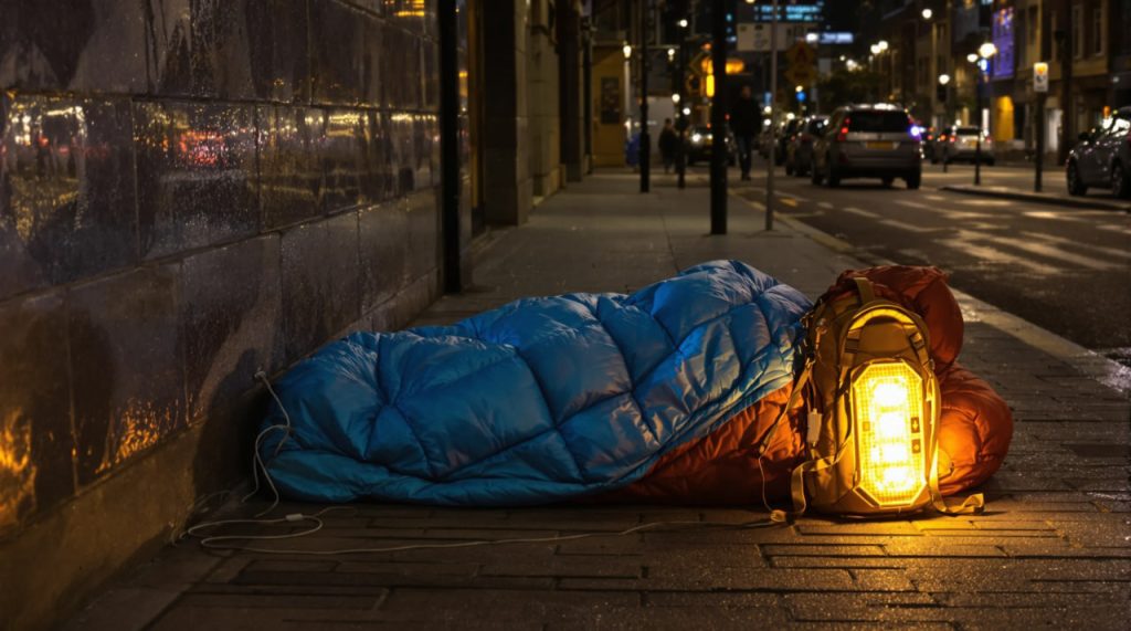 Een thermische deken op zonne-energie die zonnepanelen, slimme batterijen en thermische sensoren combineert om daklozen van duurzame warmte te voorzien.